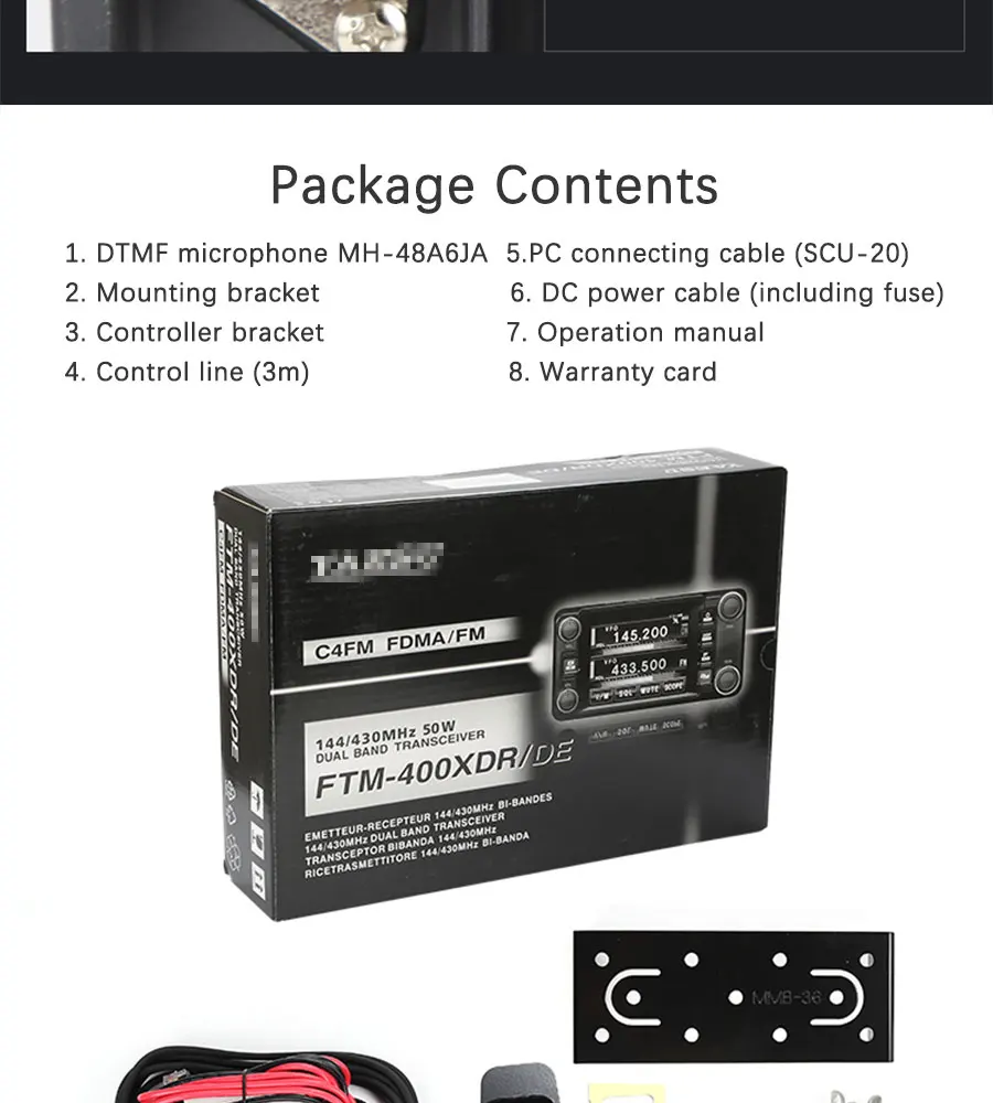 108-470 and 800-999 MHz (minus the cellular). Four scan modes support: VFO, memory, programmable memory or selected memory. 500 Memories per band are available. Each memory stores frequency, mode, tag, forwarding information, tone, DCS, antenna mute information, memory skip information, and transmission output. The screen background can be set to any of five colors (green, blue, orange, purple, or gray). The FTM-400DR can take pictures and videos by connecting USB cameras (not provided) and sending and receiving them. There is a microSD card port. |